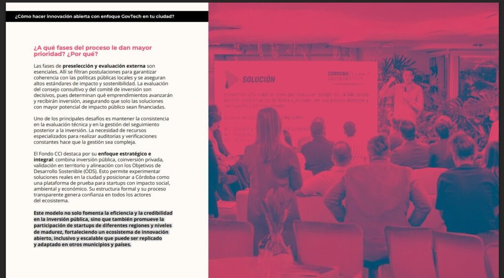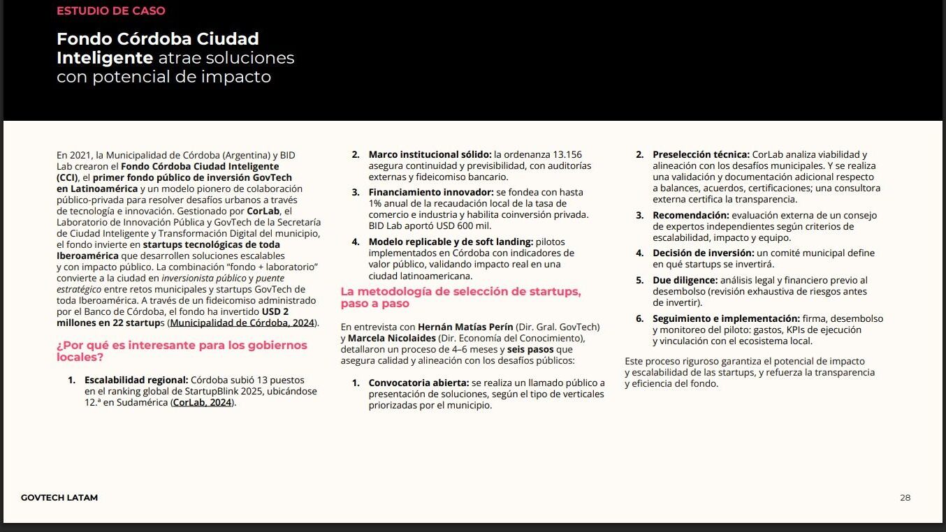 En este marco, el Fondo Córdoba Ciudad Inteligente (#FondoCCI) y el trabajo impulsado desde CorLab, el laboratorio de innovación pública de la Secretaría de Ciudad Inteligente y Transformación Digital de la Municipalidad de Córdoba, en alianza con BID Lab, son destacados como un modelo de articulación público-privada para acompañar pilotos, financiar soluciones GovTech y generar evidencia para su escalamiento.